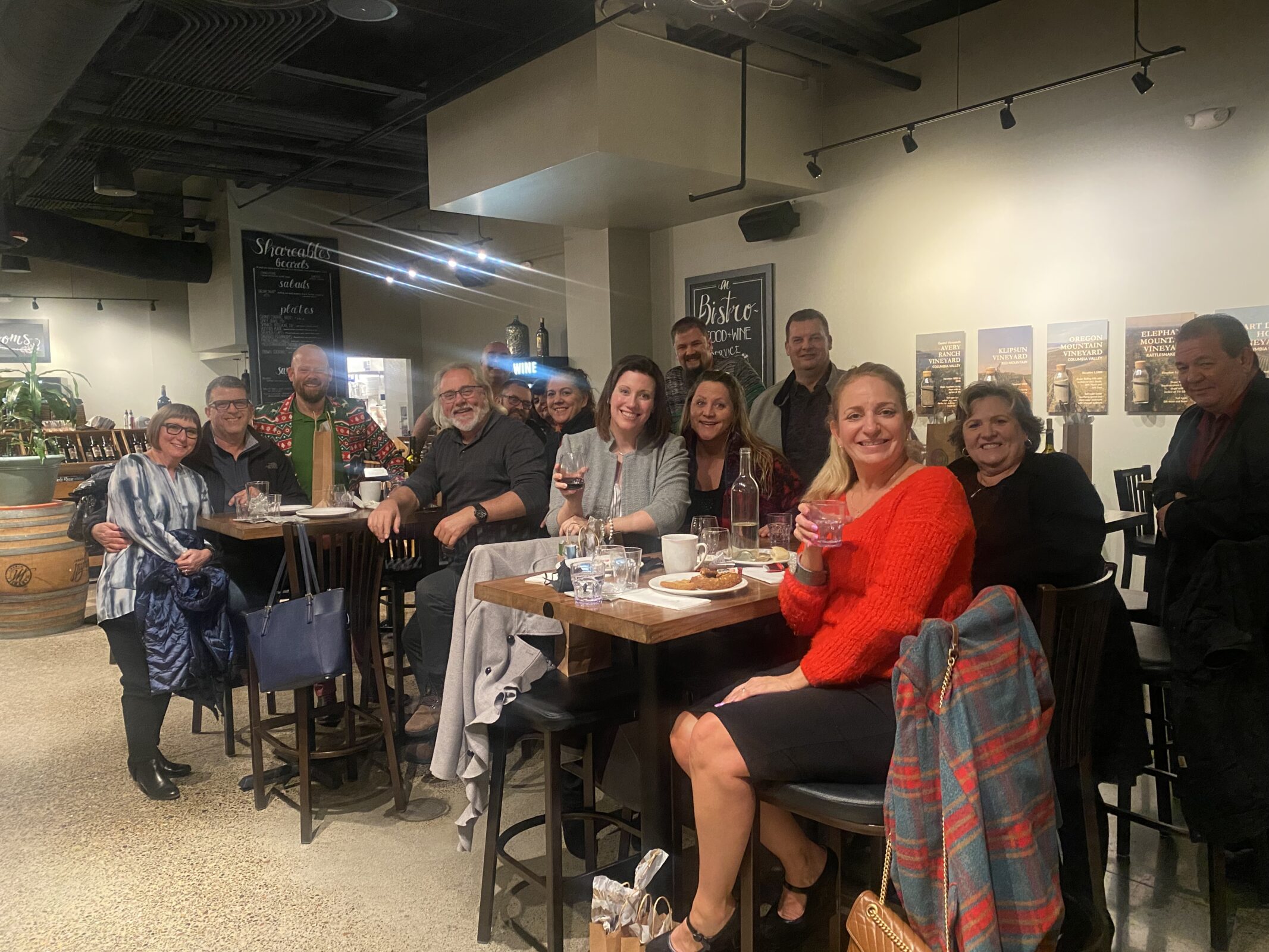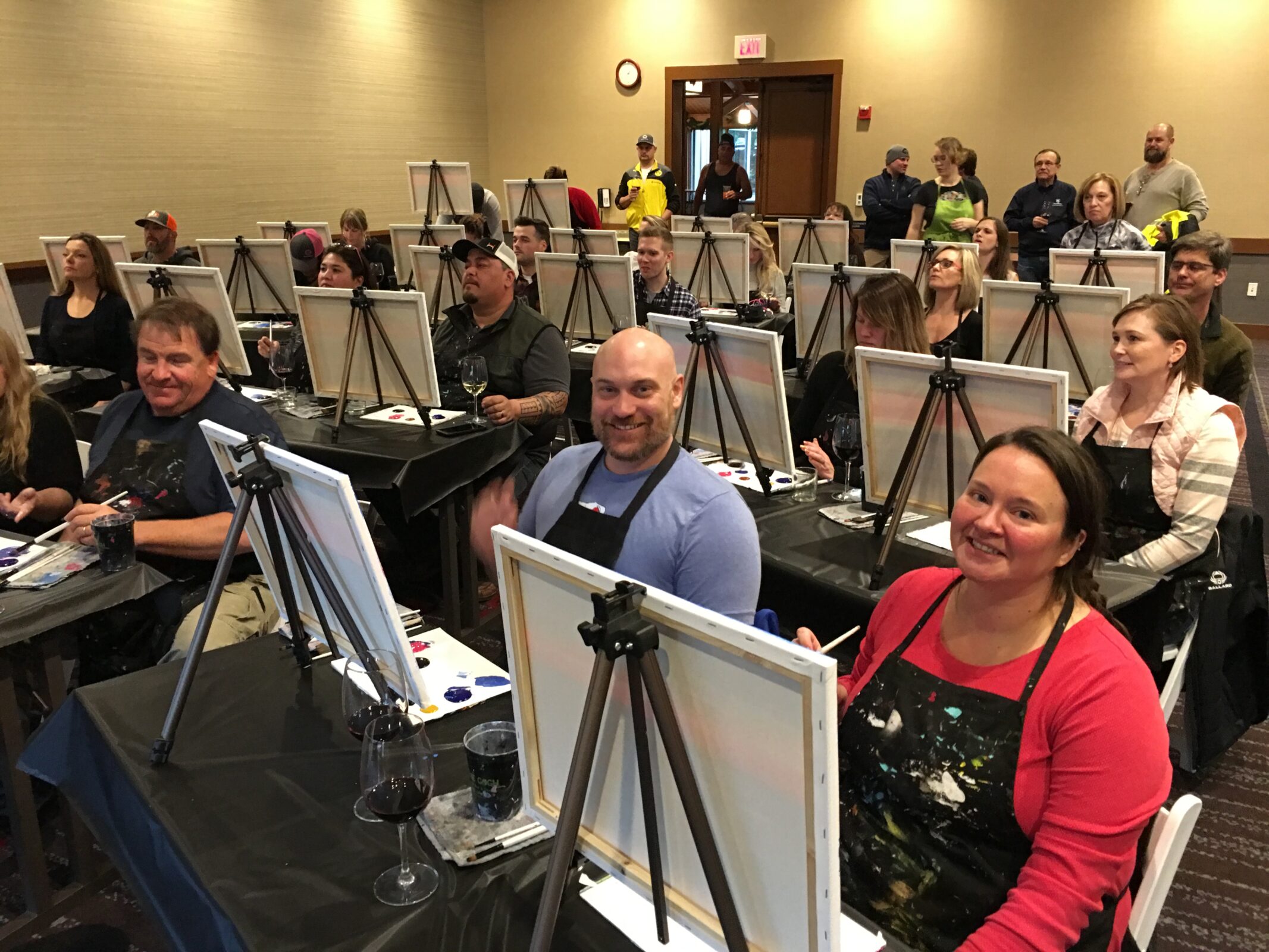 Ballard team members, and their spouses, enjoy a paint and pinot event with a Ballard project as the featured artwork.