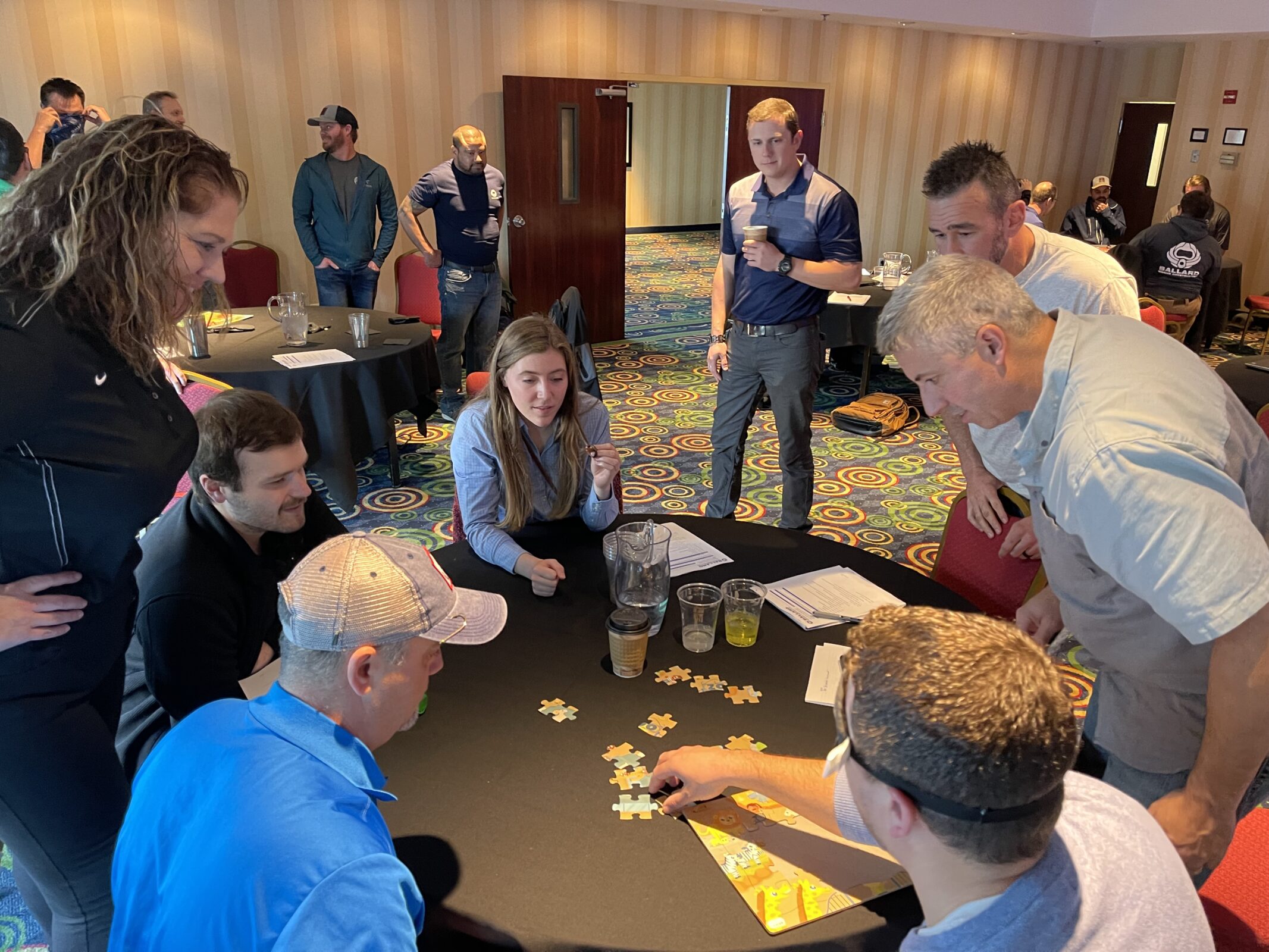 Blindfolded team members are guided to assemble a puzzle from their team during a team-building event.