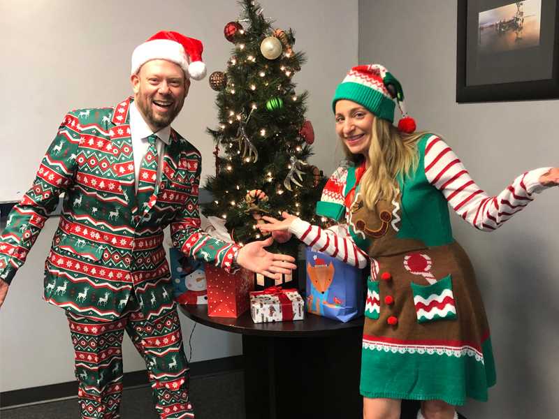 Jesse (President/CEO) and Shilo (Executive VP/CAO) Hutton, at the home office holiday ugly sweater contest and potluck event.